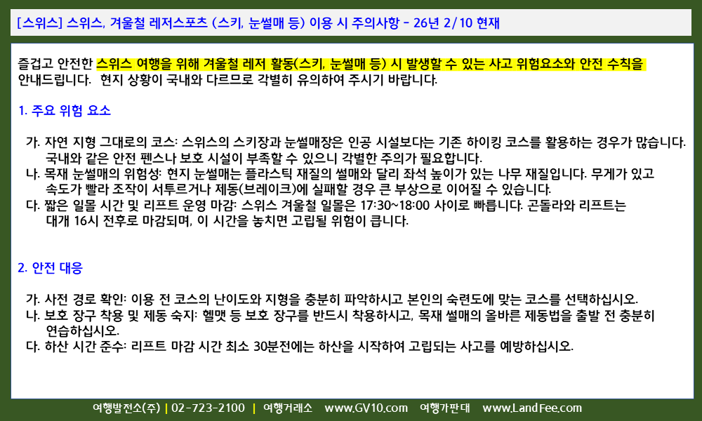[스위스] 스위스, 겨울철 레저스포츠 (스키, 눈썰매 등) 이용 시 주의사항 - 26년 2/10 현재