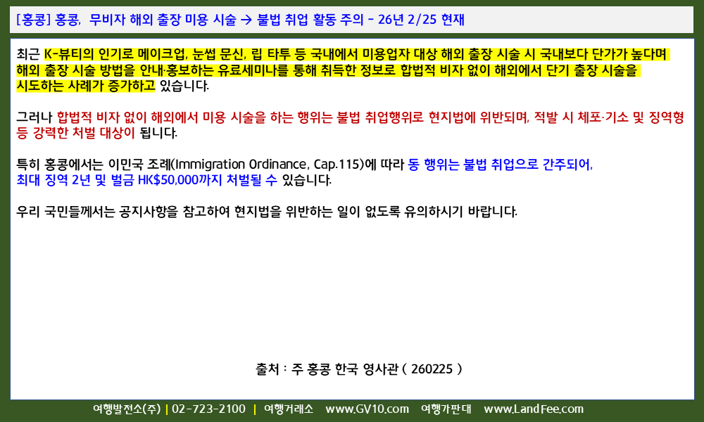 [홍콩] 홍콩, 무비자 해외 출장 미용 시술 -> 불법 취업 활동 주의 - 26년 2/25 현재