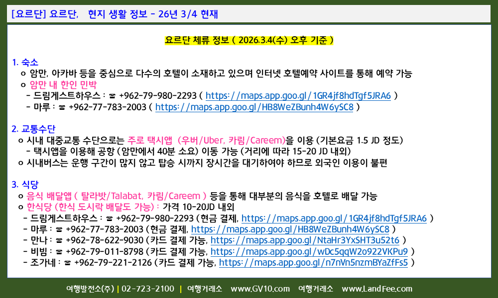 - 드림게스트하우스 : ☎ +962-79-980-2293 (현금 결제, https://maps.app.goo.gl/1GR4jf8hdTgf5JRA6 )