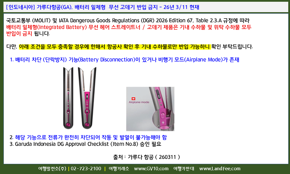 [인도네시아] 가루다항공(GA), 배터리 일체형 무선 고데기 반입 금지 - 26년 3/11 현재