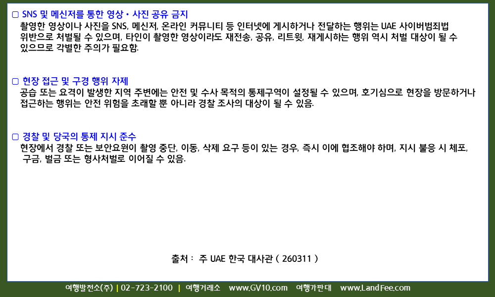 [UAE, 아랍에미리트] UAE, 현지 발생 공습‧피격 현장 -> 촬영 및 유포 행위 관련 주의 - 26년 3/11 현재