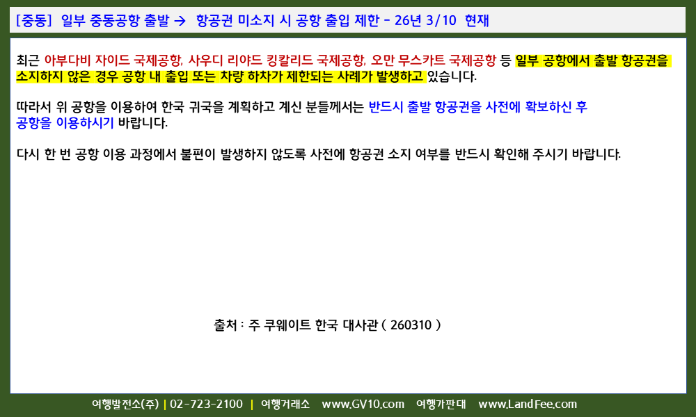 [중동] 일부 중동공항 출발 -> 항공권 미소지 시 공항 출입 제한 - 26년 3/10 현재