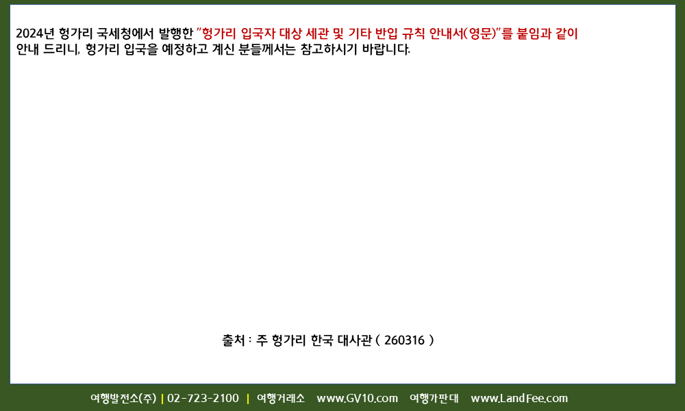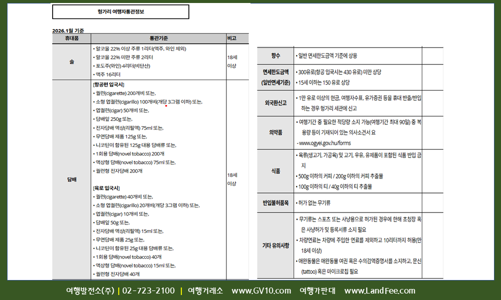 [헝가리] 헝가리, 입국자 대상 -> 세관 및 휴대품 반입 규정 - 26년 3/16 현재