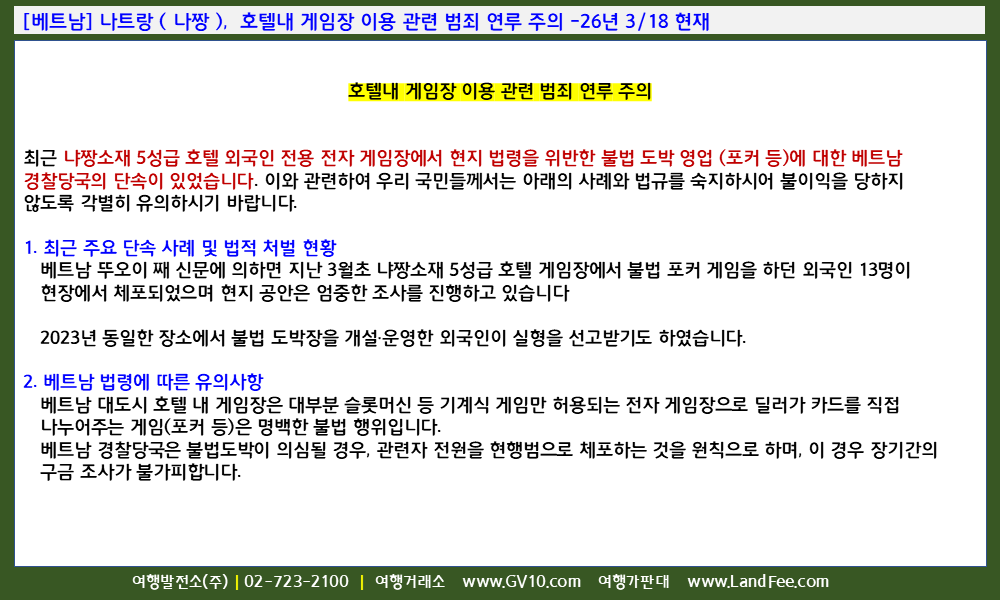 [베트남] 나트랑 ( 나짱 ), 호텔내 게임장 이용 관련 범죄 연루 주의 -26년 3/18 현재