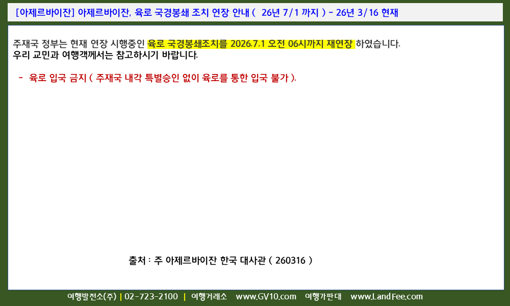 [아제르바이잔] 아제르바이잔, 육로 국경봉쇄 조치 연장 안내 ( 26년 7/1 까지 ) - 26년 3/16 현재