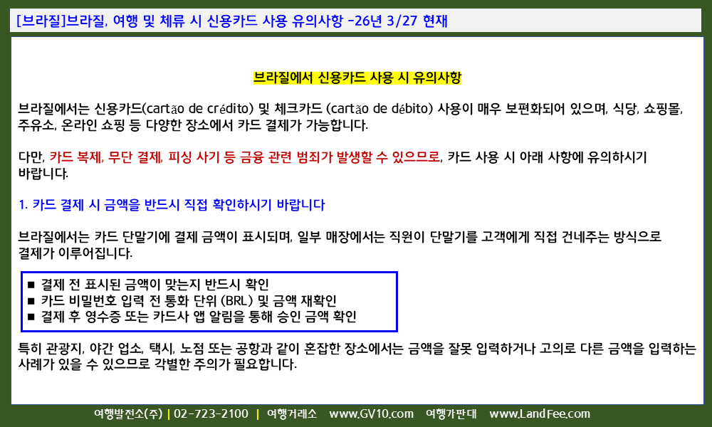 [브라질] 브라질, 여행 및 체류 시 신용카드 사용 유의사항 -26년 3/27 현재