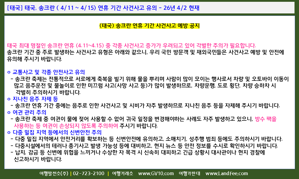 [태국] 태국, 송크란 ( 4/11 ~ 4/15) 연휴 기간 사건사고 유의 - 26년 4/2 현재