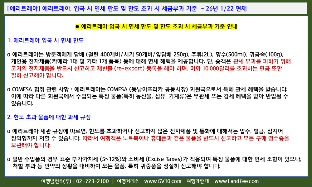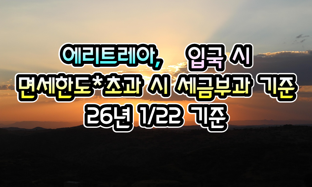 [에리트레아] 에리트레아, 입국 시 면세 한도 및 한도 초과 시 세금부과 기준 - 26년 1/22 현재