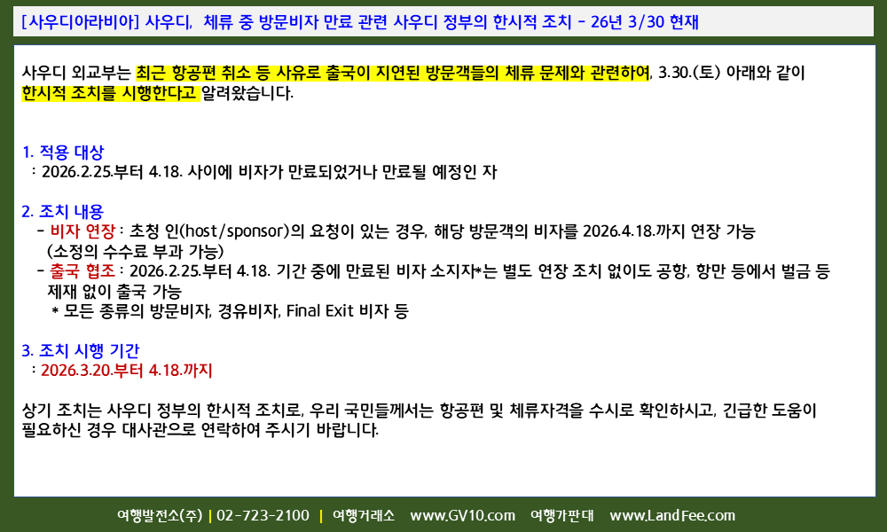 [사우디아라비아] 사우디, 체류 중 방문비자 만료 -> 사우디 정부의 한시적 조치 - 26년 3/30 현재