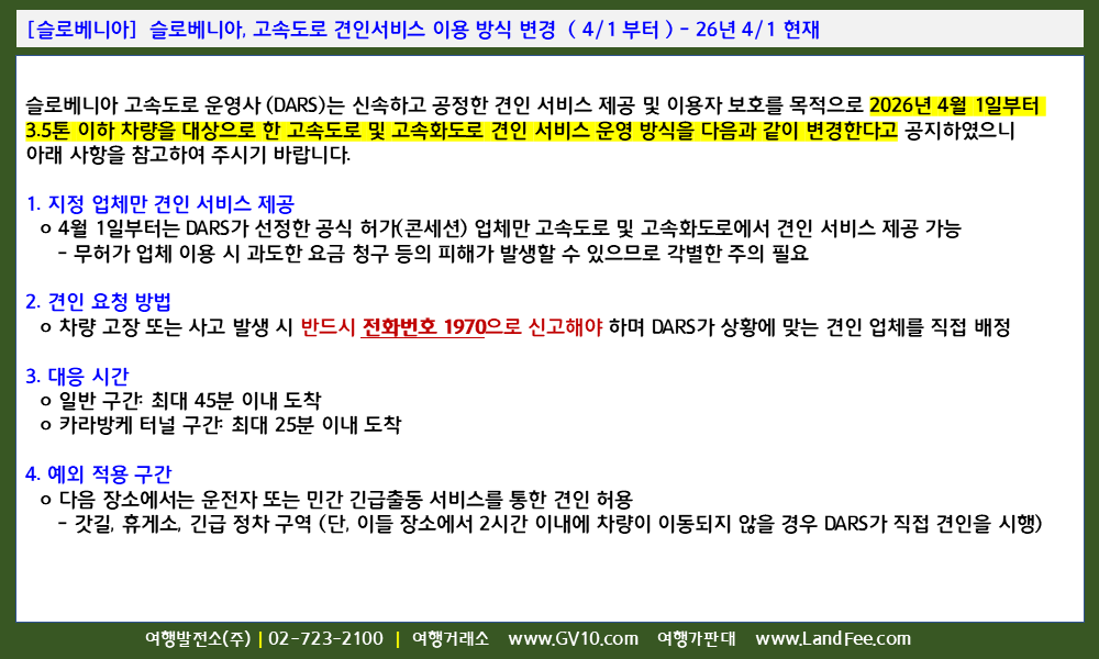 [슬로베니아] 슬로베니아, 고속도로 견인서비스 이용 방식 변경 ( 4/1 부터 ) - 26년 4/1 현재