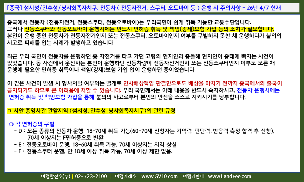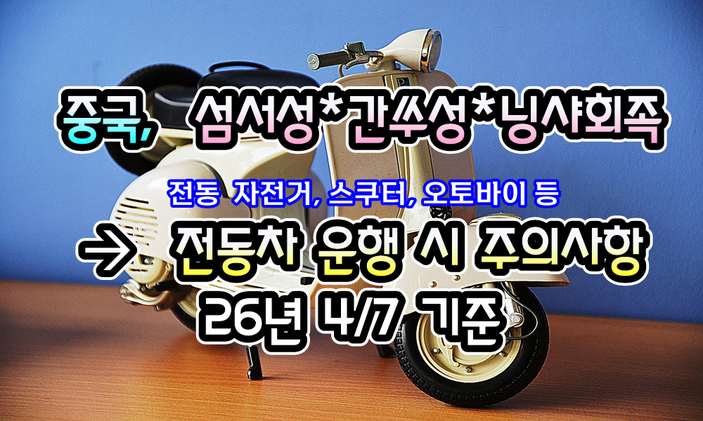 [중국] 섬서성/간쑤성/닝샤회족자치구, 전동차 ( 전동자전거, 스쿠터, 오토바이 등 ) 운행 시 주의사항 - 26년 4/7 현재