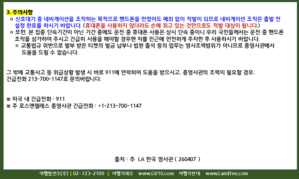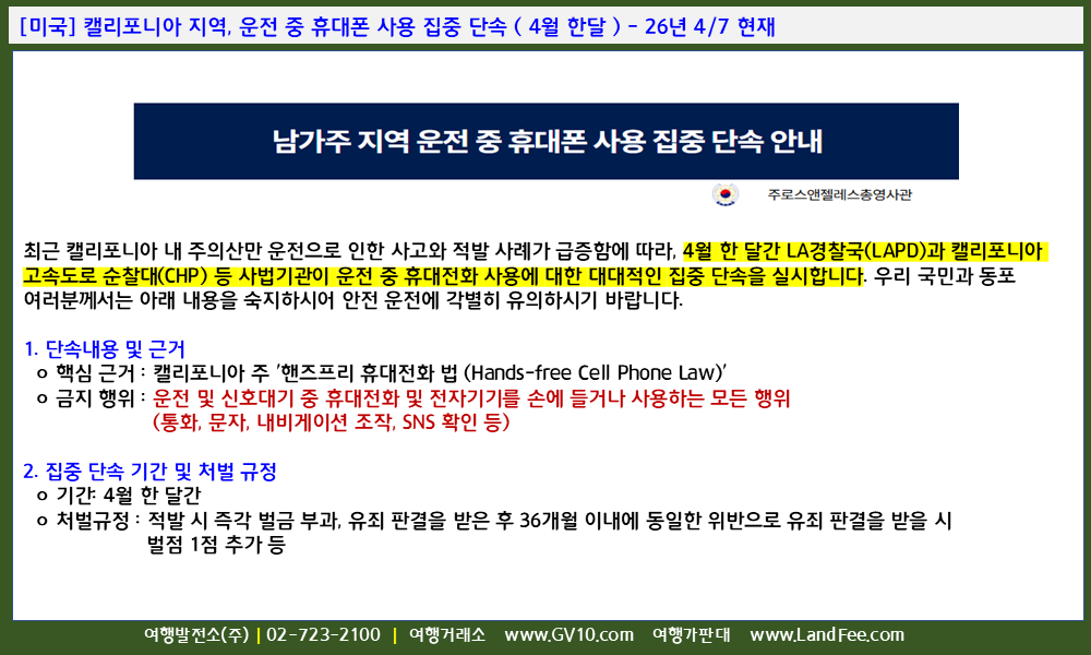 [미국] 캘리포니아 지역, 운전 중 휴대폰 사용 집중 단속 ( 4월 한달 ) - 26년 4/7 현재