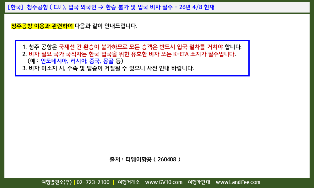 [한국] 청주공항 ( CJJ ), 입국 외국인 -> 환승 불가 및 입국 비자 필수 - 26년 4/8 현재
