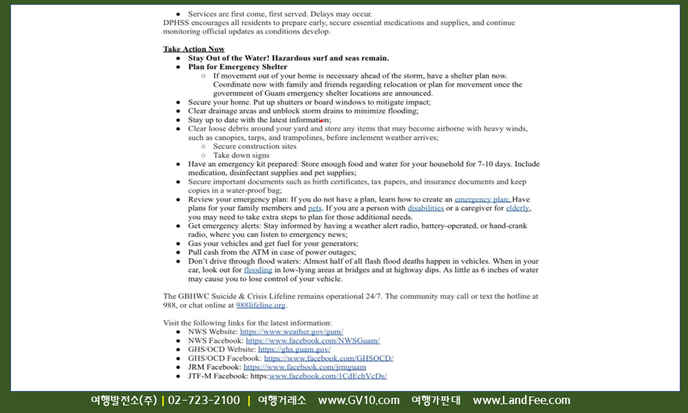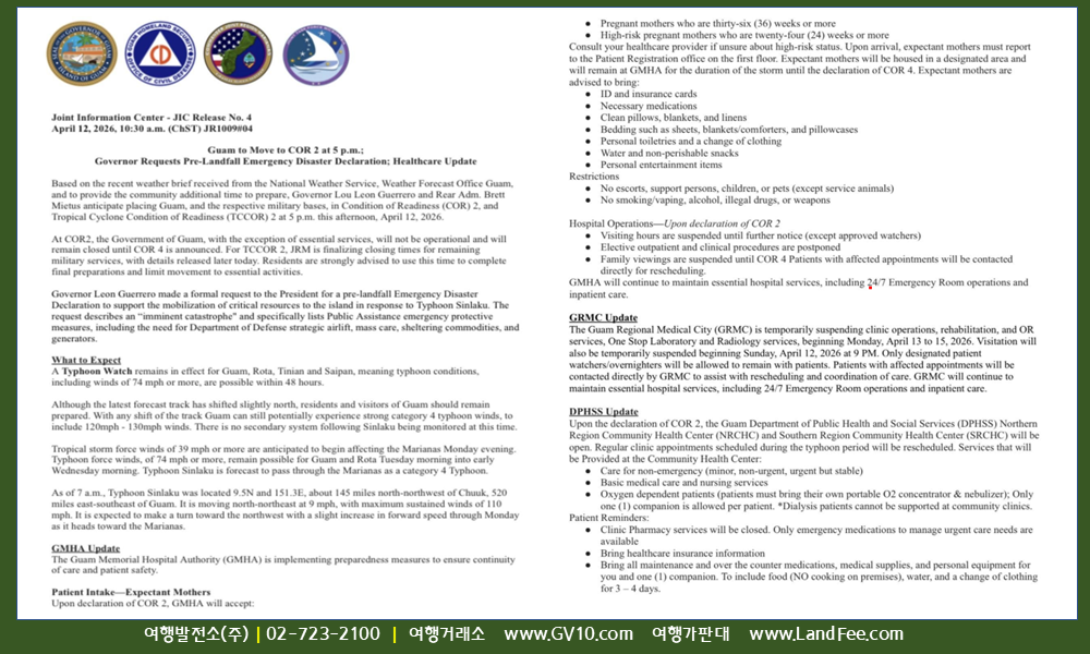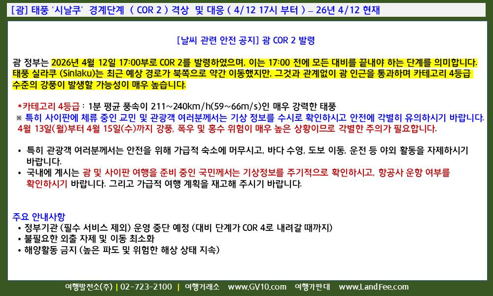 [괌] 태풍 ‘시날쿠’ 경계단계 ( COR 2 ) 격상 및 대응 ( 4/12 17시 부터 ) – 26년 4/12 현재
