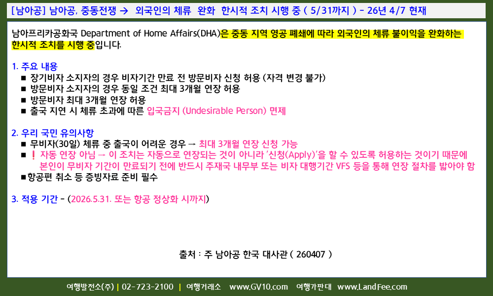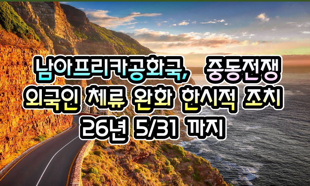 [남아공] 남아공, 중동전쟁 -> 외국인의 체류 완화 한시적 조치 시행 중 ( 5/31까지 ) - 26년 4/7 현재