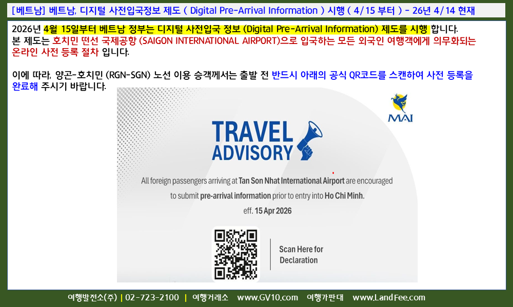 [베트남] 베트남, 디지털 사전입국정보 제도 ( Digital Pre-Arrival Information ) 시행 ( 4/15 부터 ) - 26년 4/14 현재