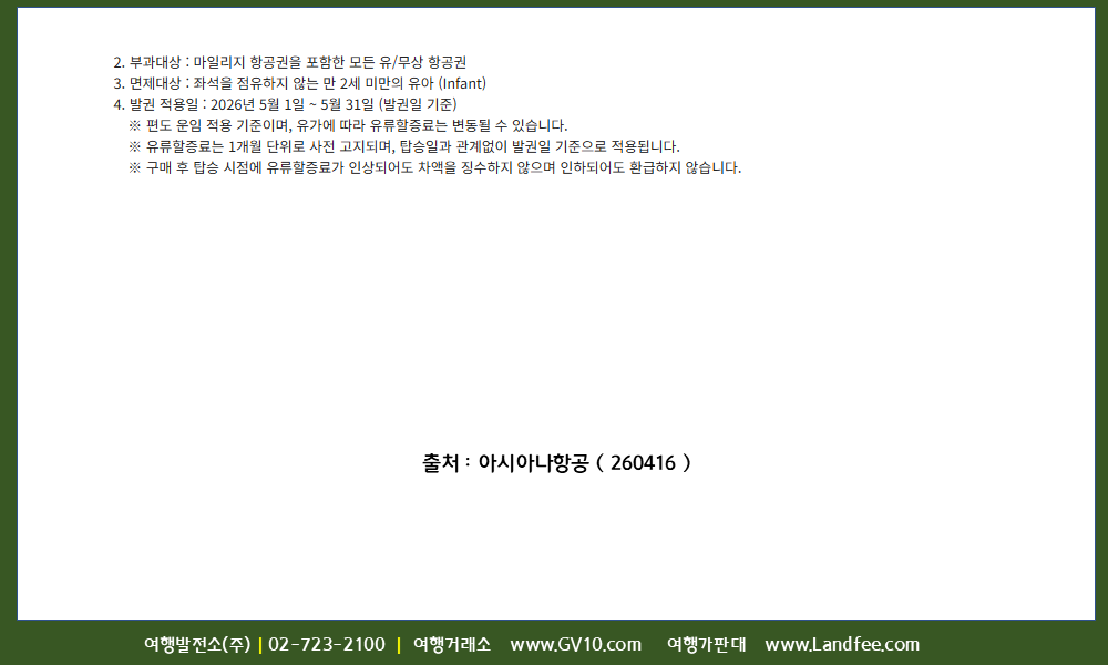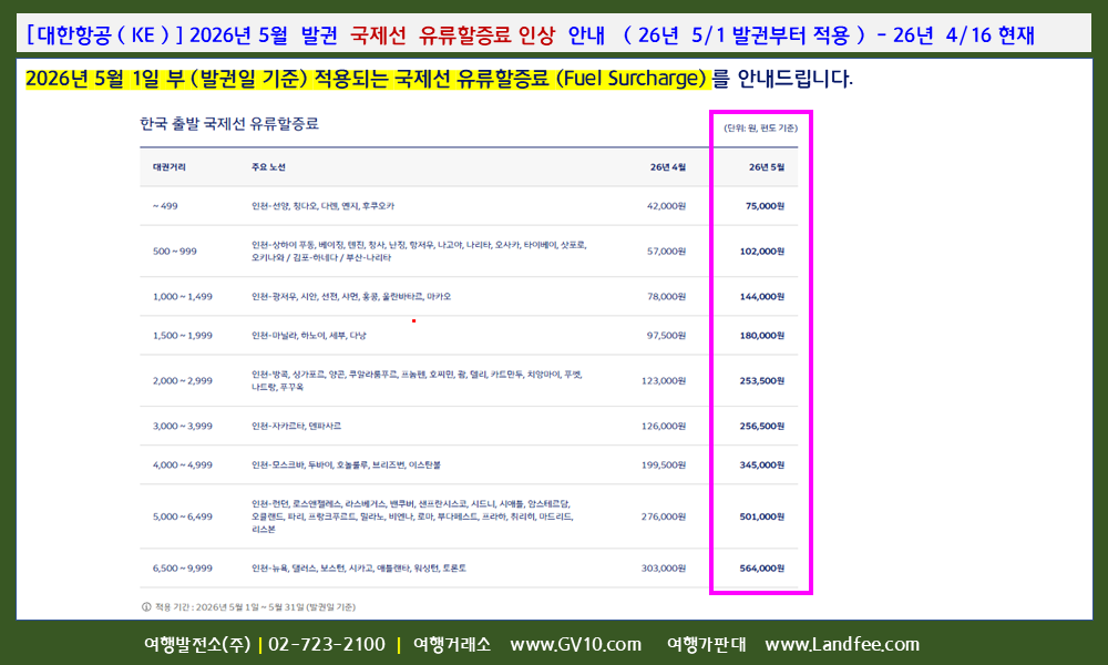 [대한항공/아시아나항공 ] KE/OZ, 2026년 5월 발권 국제선 유류할증료 인상 안내 ( 26년 5/1 발권부터 적용 ) - 26년 4/16 현재