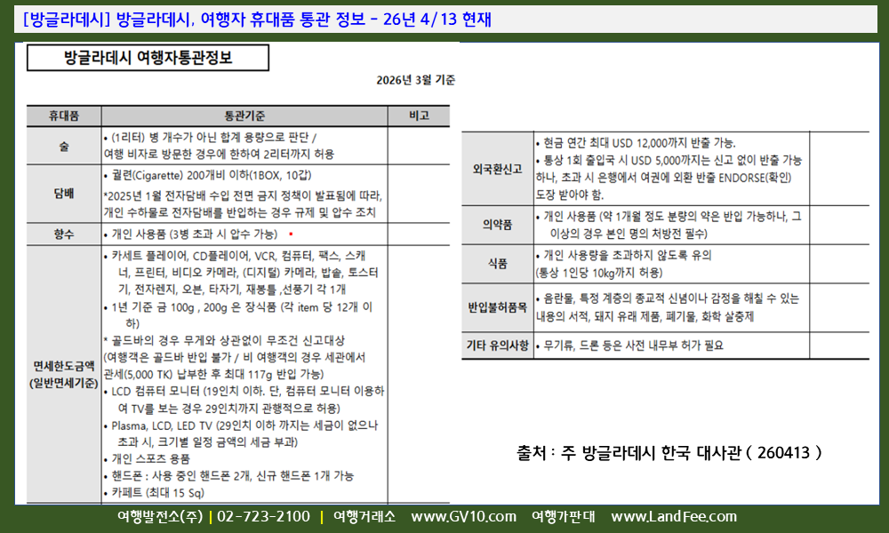 [방글라데시] 방글라데시, 여행자 휴대품 통관 정보 - 26년 4/13 현재