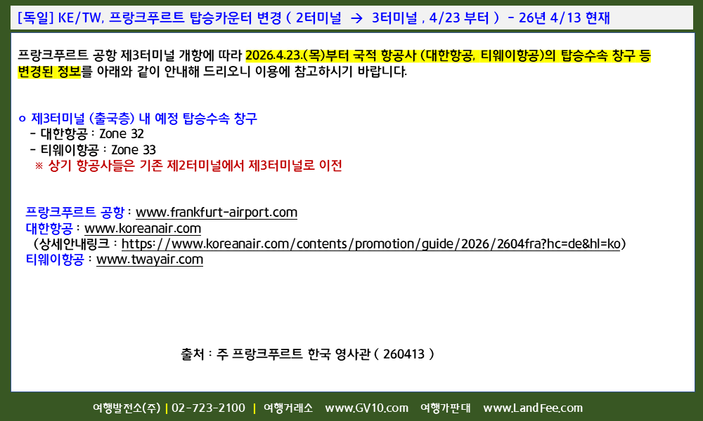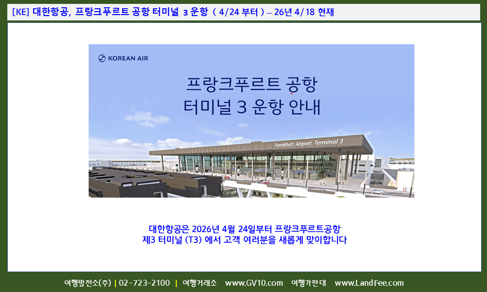 대한항공 : www.koreanair.com (상세안내링크 : https://www.koreanair.com/contents/promotion/guide/2026/2604fra?hc=de&hl=ko)