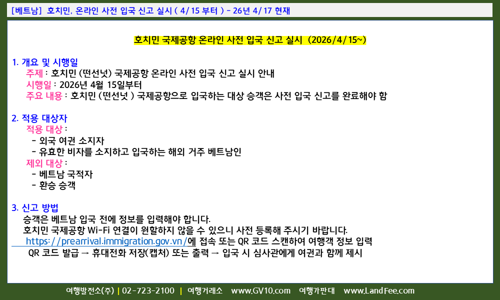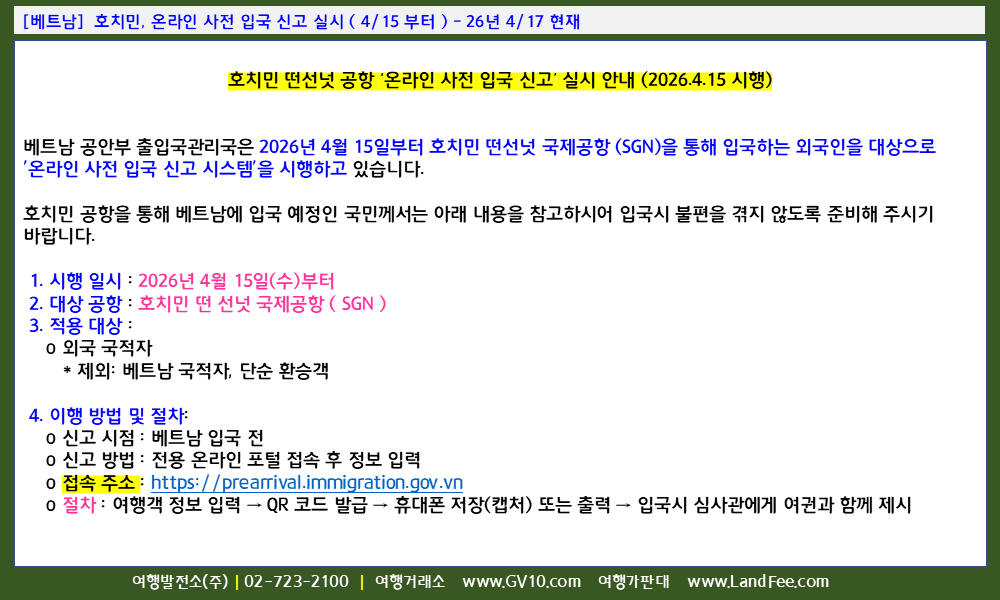 [베트남] 호치민, 온라인 사전 입국 신고 실시 ( 4/15 부터 ) - 26년 4/17 현재