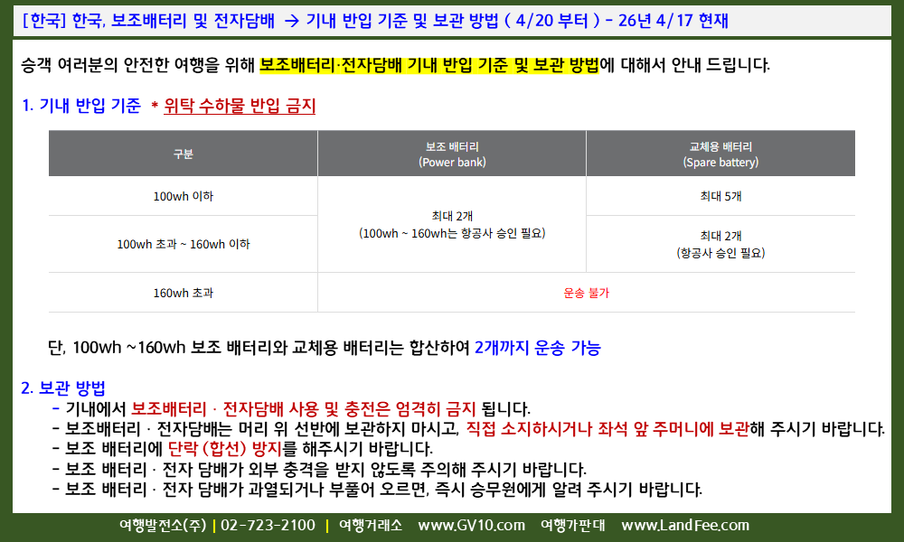 [한국] 한국, 보조배터리 및 전자담배 -> 기내 반입 기준 및 보관 방법 ( 4/20 부터 ) - 26년 4/17 현재
