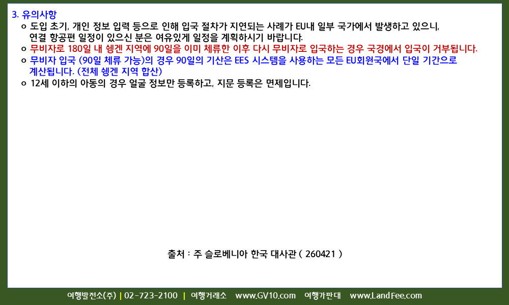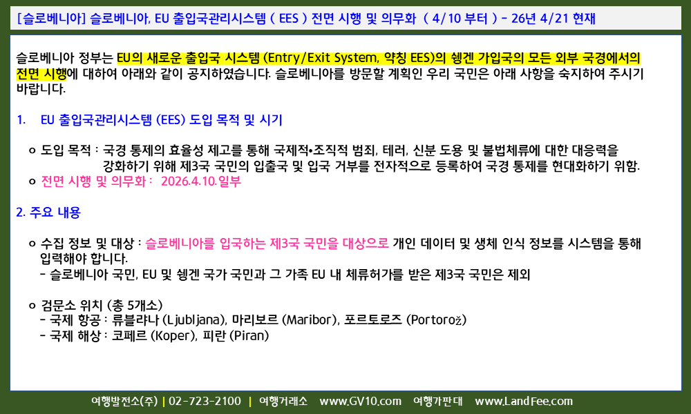[슬로베니아] 슬로베니아, EU 출입국관리시스템 ( EES ) 전면 시행 및 의무화 ( 4/10 부터 ) - 26년 4/21 현재