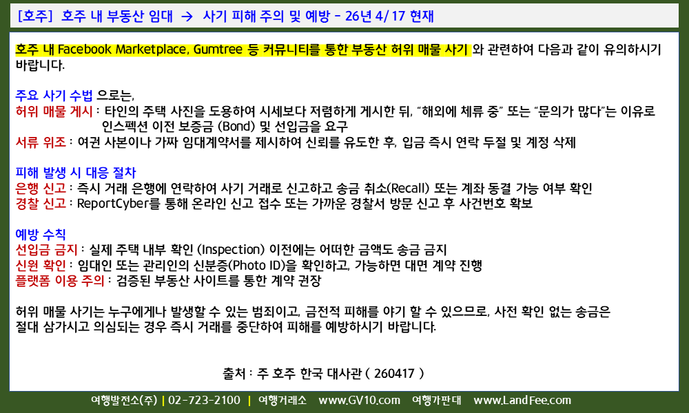 [호주] 호주 내 부동산 임대 -> 사기 피해 주의 및 예방 - 26년 4/17 현재