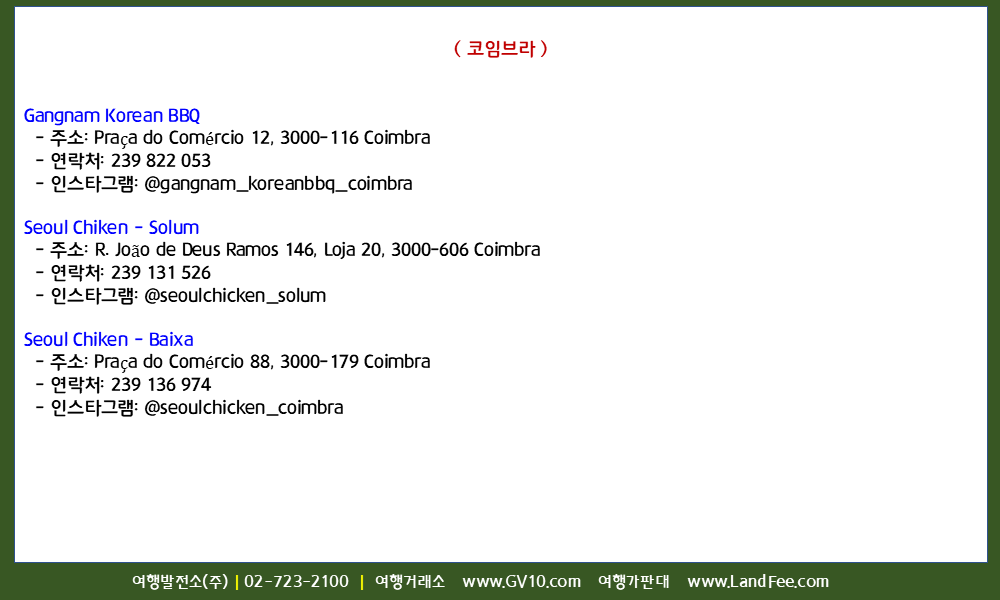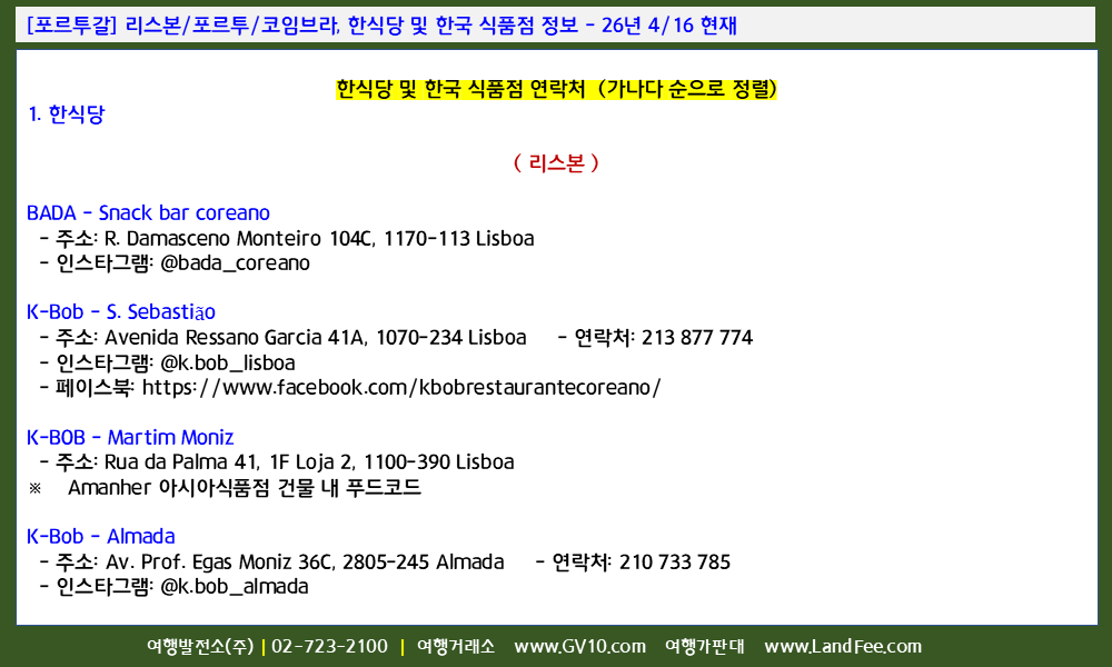 [포르투갈] 리스본/포르투/코임브라, 한식당 및 한국 식품점 정보 - 26년 4/16 현재