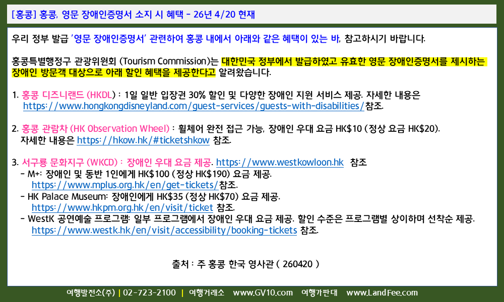 3. 서구룡 문화지구 (WKCD) : 장애인 우대 요금 제공. https://www.westkowloon.hk