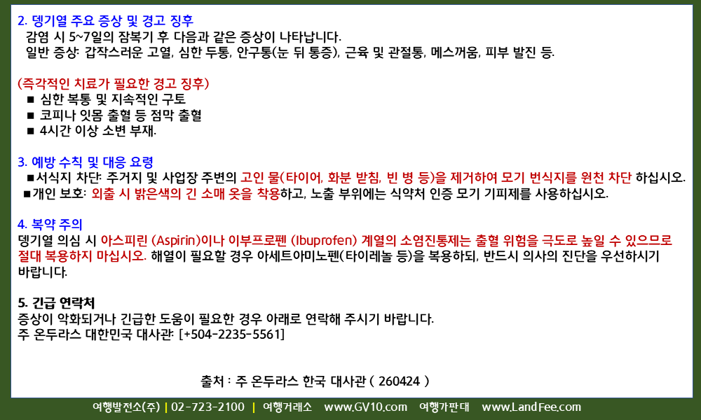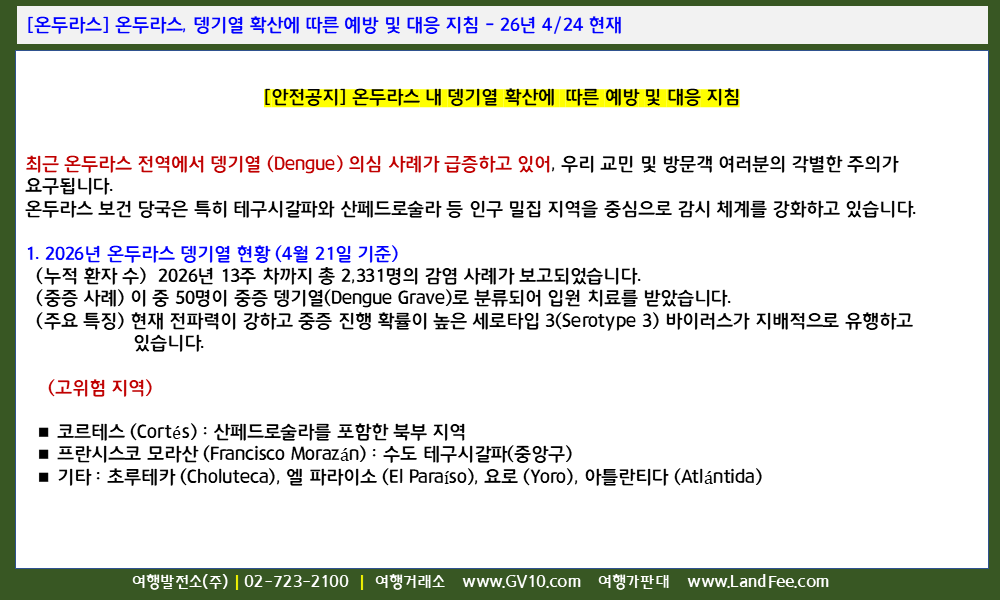 [온두라스] 온두라스, 뎅기열 확산에 따른 예방 및 대응 지침 - 26년 4/24 현재
