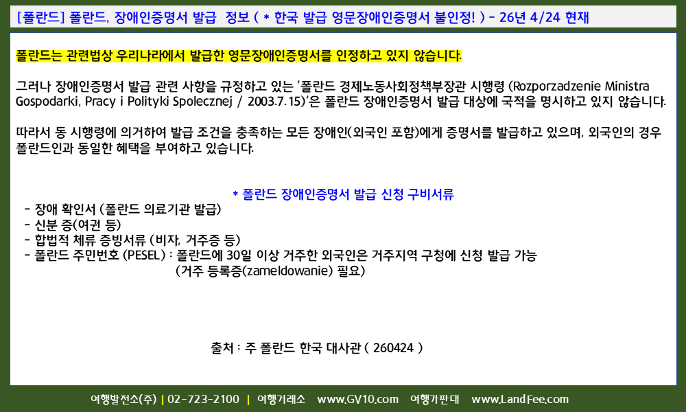 [폴란드] 폴란드, 장애인증명서 발급 정보 ( * 한국 발급 영문장애인증명서 불인정! ) - 26년 4/24 현재