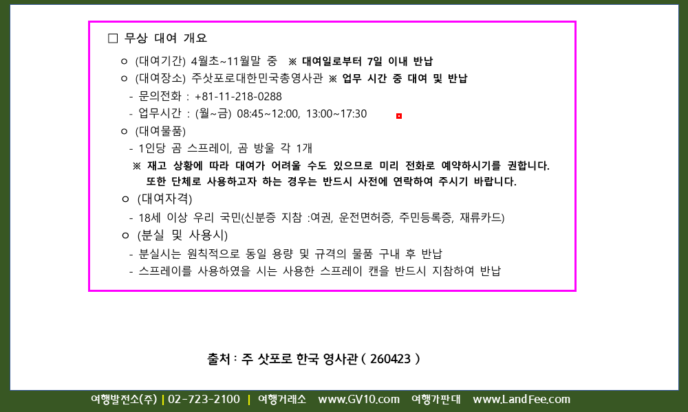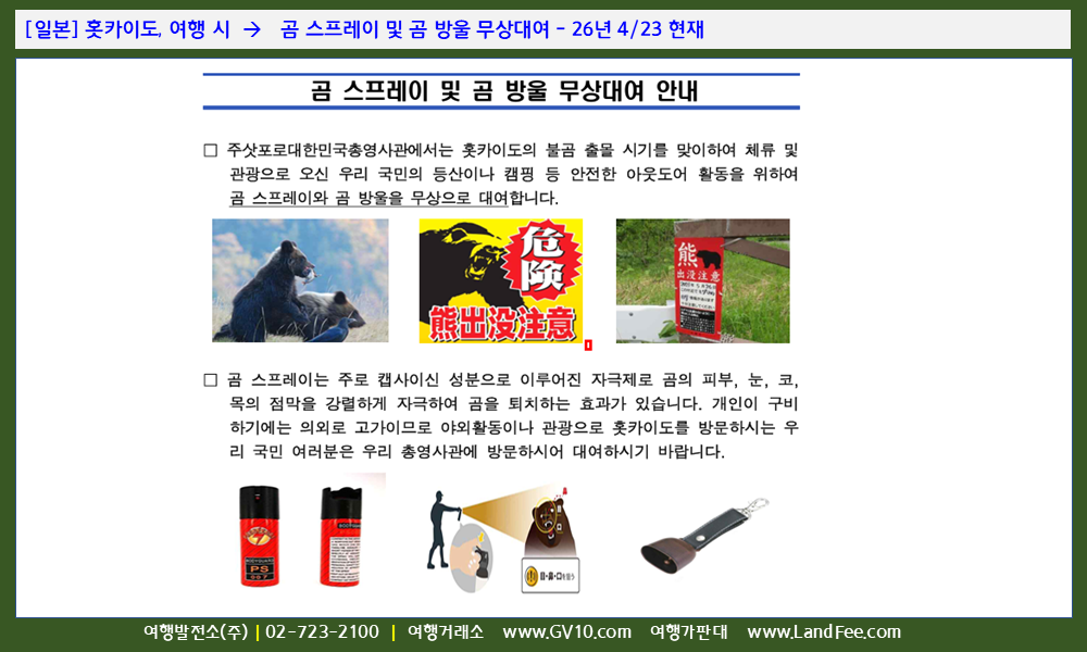[일본] 홋카이도, 여행 시 -> 곰 스프레이 및 곰 방울 무상대여 - 26년 4/23 현재