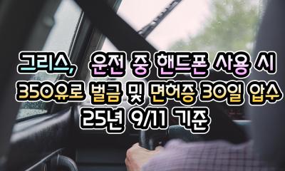 [그리스] 그리스, 운전 중 휴대전화 사용 시 최소 범칙금 350유로 부과 및 운전면허증 30일간 압수 조치 - 25년 9/10 현재