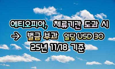 [에티오피아] 에티오피아, 체류기간 도과 시 벌금 (일당 30 USD) 부과 - 25년 11/18 현재