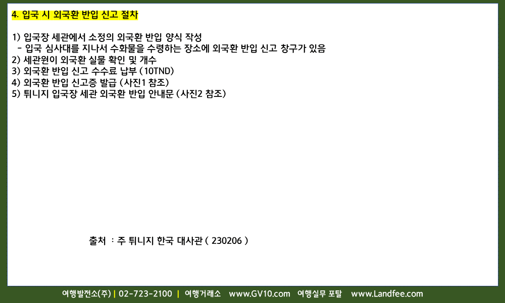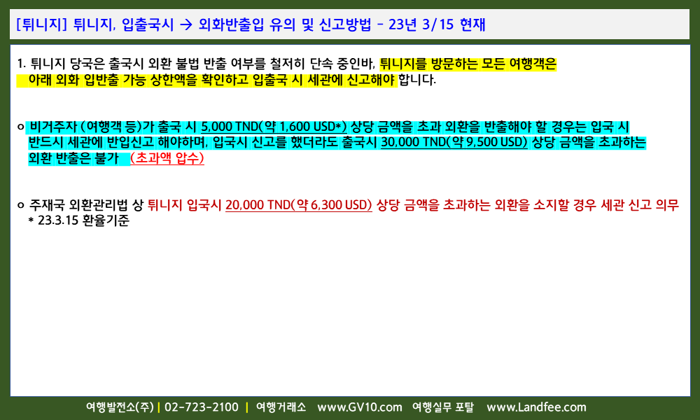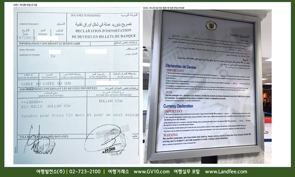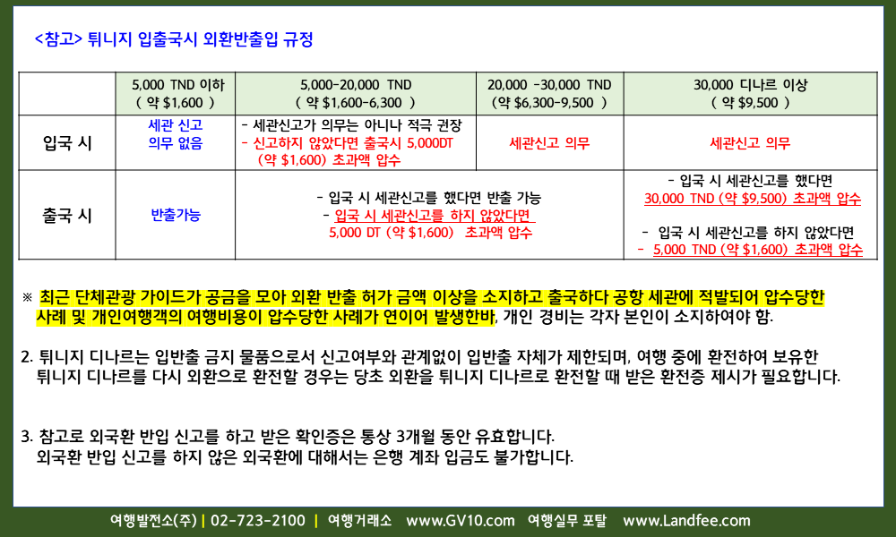 [튀니지] 튀니지, 입출국 시 -> 외화반출입 유의 및 신고방법 - 23년 3/15 현재