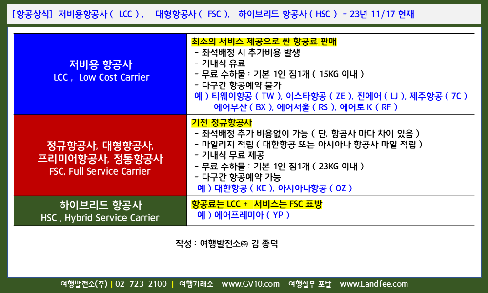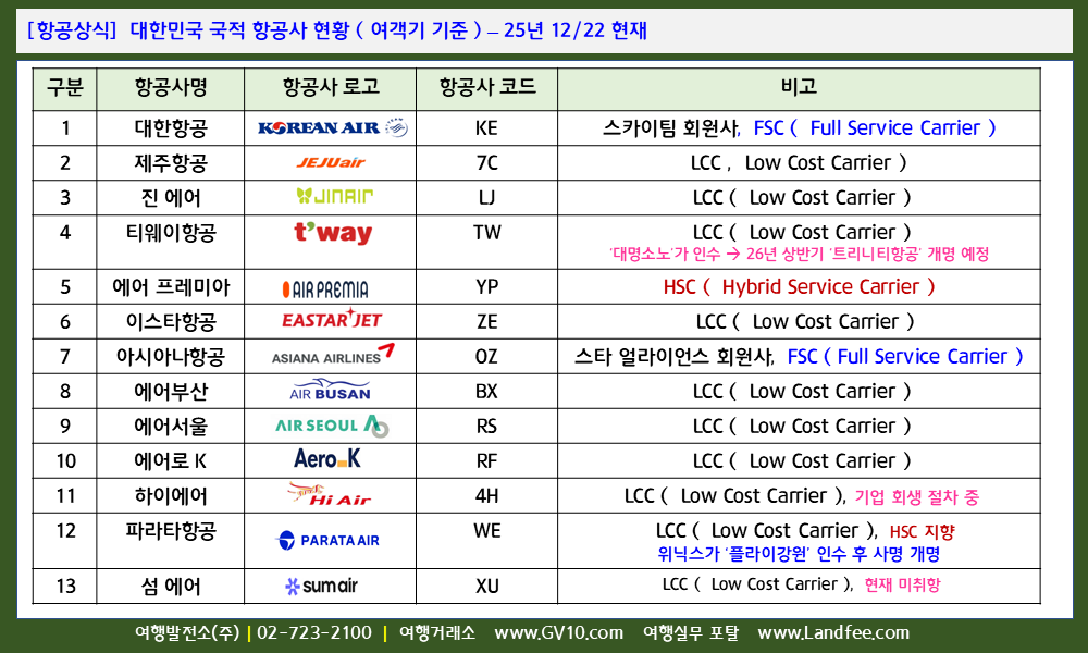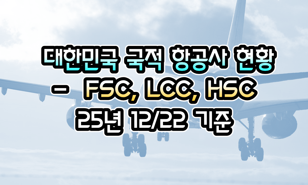 [항공상식] 대한민국, 국적 항공사 ( FSC, LCC, HSC ) 현황 ( 여객기 기준 ) – 25년 12/22 현재