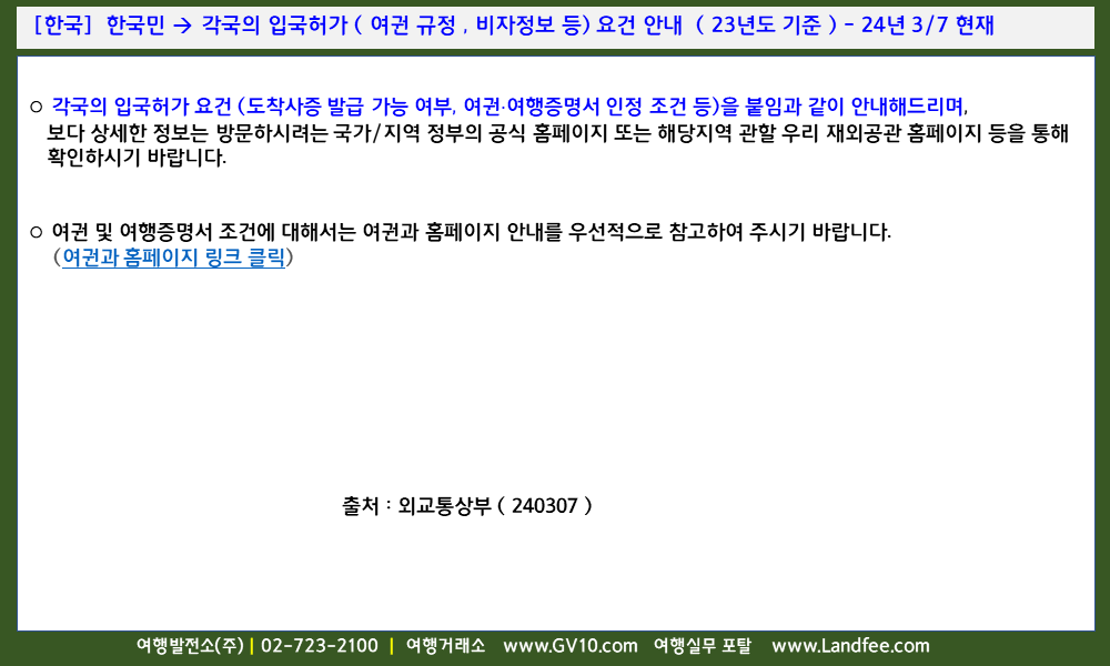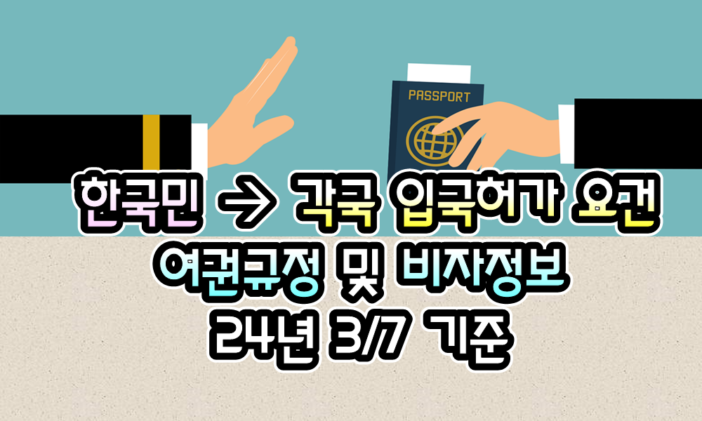 [한국] 한국민 -> 각국의 입국허가 ( 여권 규정 , 비자정보 등) 요건 안내 ( 23년도 기준 ) - 24년 3/7 현재
