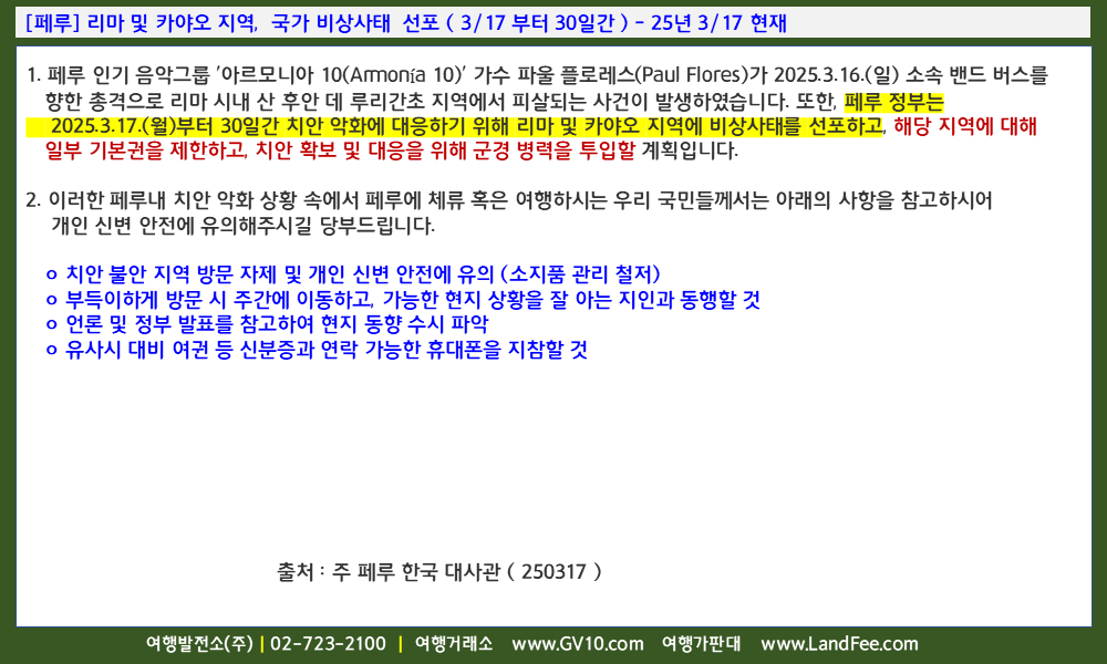 [페루] 리마 및 카야오 지역, 국가 비상사태 선포 ( 3/17 부터 30일간 ) - 25년 3/17 현재