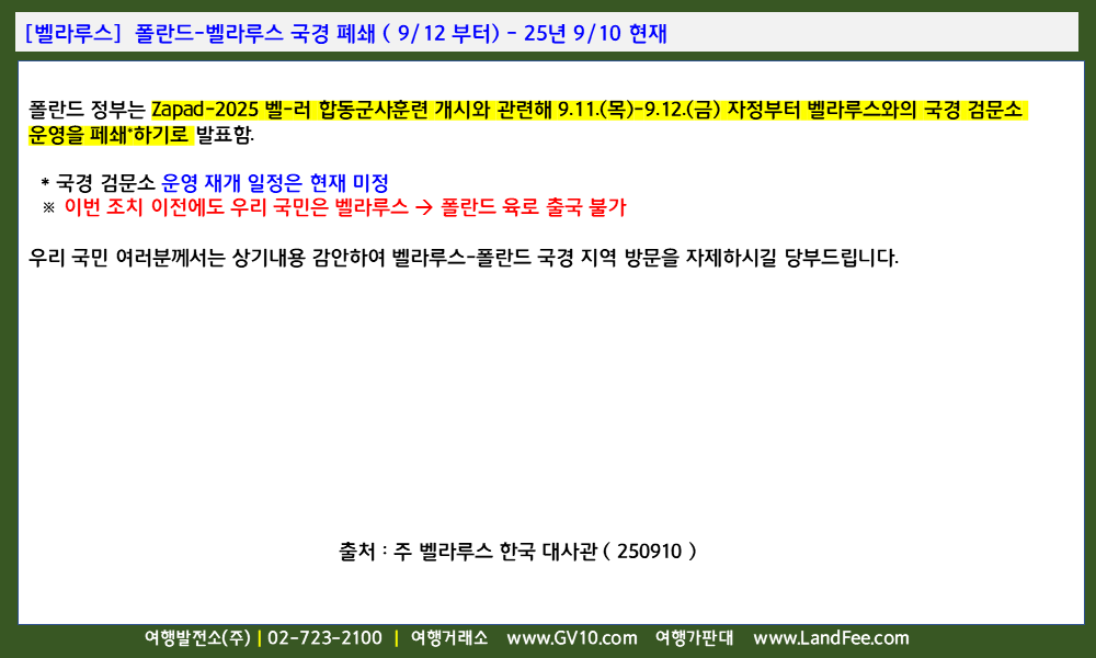 [벨라루스] 폴란드-벨라루스 국경 폐쇄 ( 9/12 부터) - 25년 9/10 현재