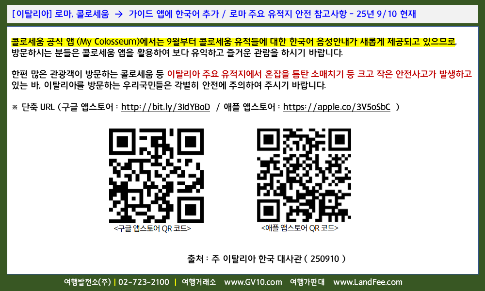[이탈리아] 로마, 콜로세움 -> 가이드 앱에 한국어 추가 / 로마 주요 유적지 안전 참고사항 - 25년 9/10 현재