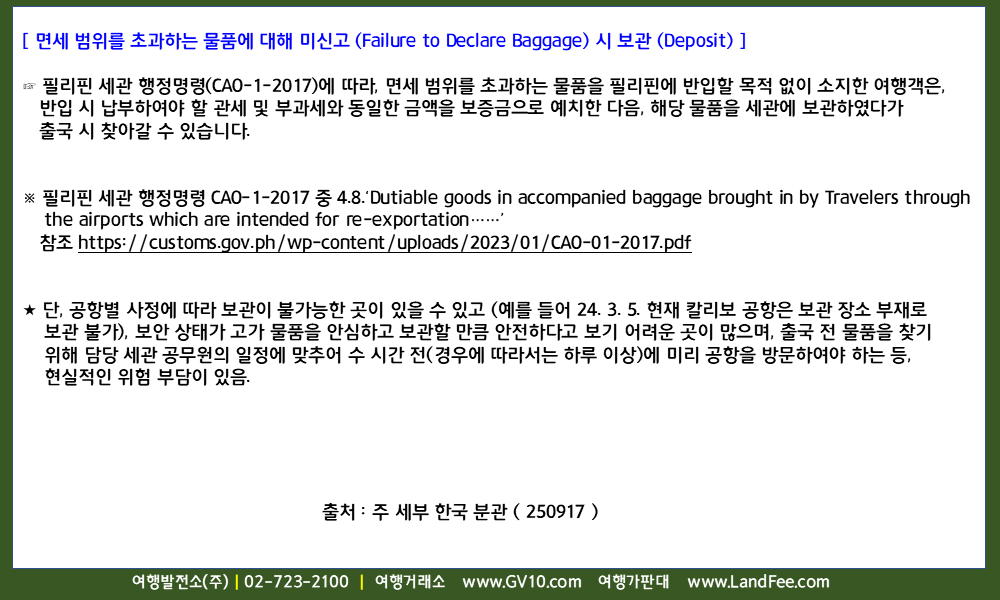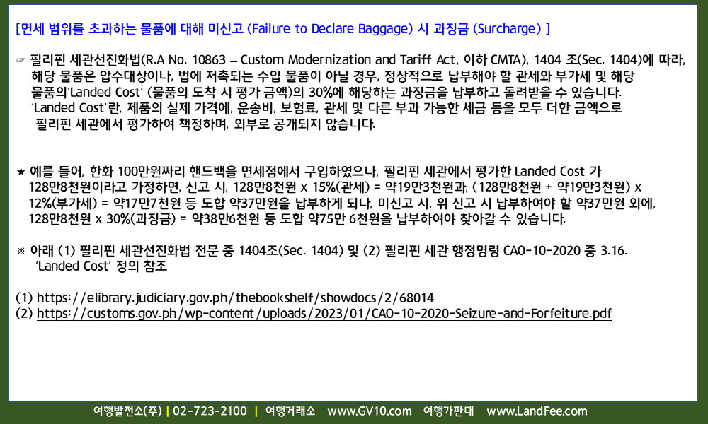 (1) 필리핀 세관(Bureau of Custom)의 ‘도착 여행객 가이드라인’ 및