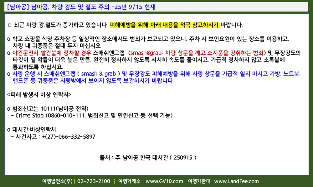 [남아공] 남아공, 차량 강도 및 절도 주의 -25년 9/15 현재