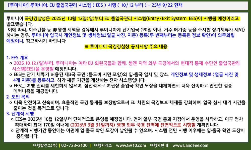 [루마니아] 루마니아, EU 출입국관리 시스템 ( EES ) 시행 ( 10/12 부터 ) - 25년 9/22 현재