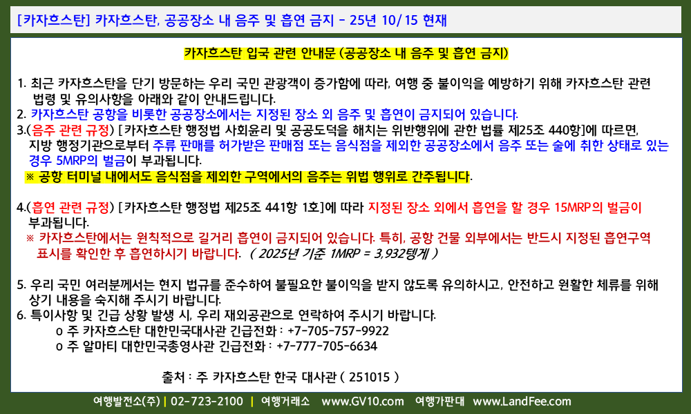 [카자흐스탄] 카자흐스탄, 공공장소 내 음주 및 흡연 금지 - 25년 10/15 현재