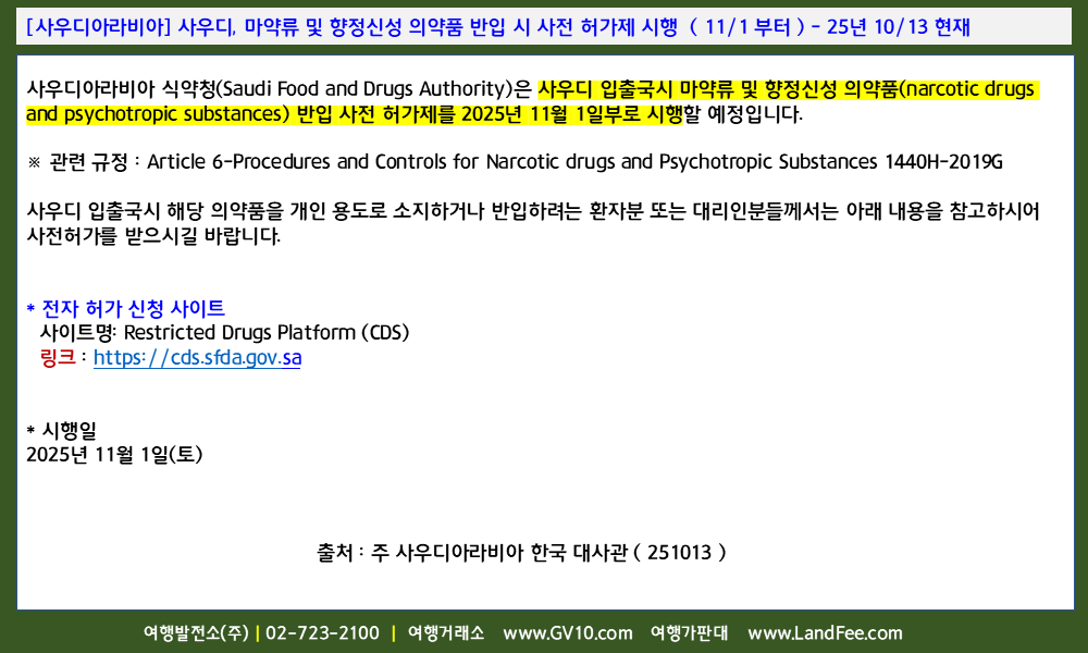 [사우디아라비아] 사우디, 마약류 및 향정신성 의약품 반입 시 사전 허가제 시행 ( 11/1 부터 ) - 25년 10/13 현재