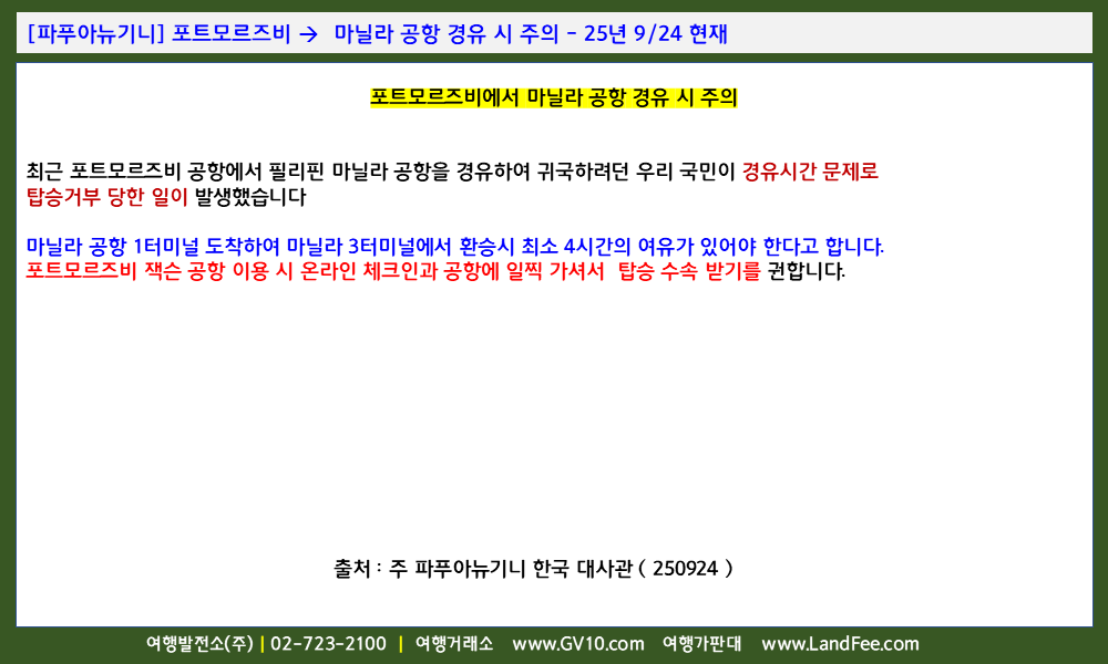 [파푸아뉴기니] 포트모르즈비 -> 마닐라 공항 경유 시 주의 - 25년 9/24 현재