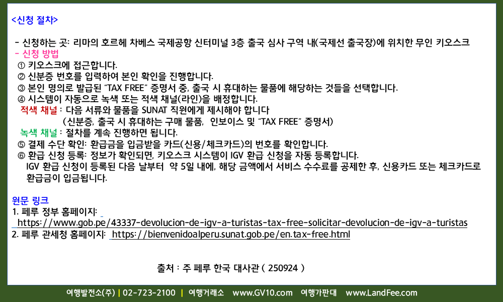 [페루] 페루, 관광객 대상 -> 부가가치세 ( IGV ) 환급 (Tax Free) 신청 정보 - 25년 9/24 현재