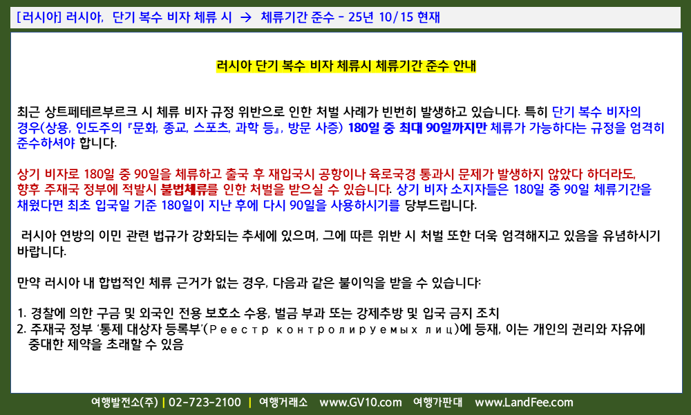 [러시아] 러시아, 단기 복수 비자 체류 시 -> 체류기간 준수 - 25년 10/15 현재