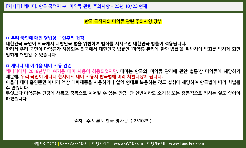 [캐나다] 캐나다, 한국 국적자 -> 마약류 관련 주의사항 - 25년 10/23 현재
