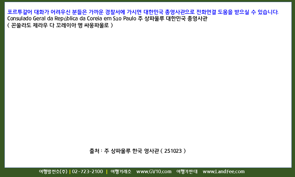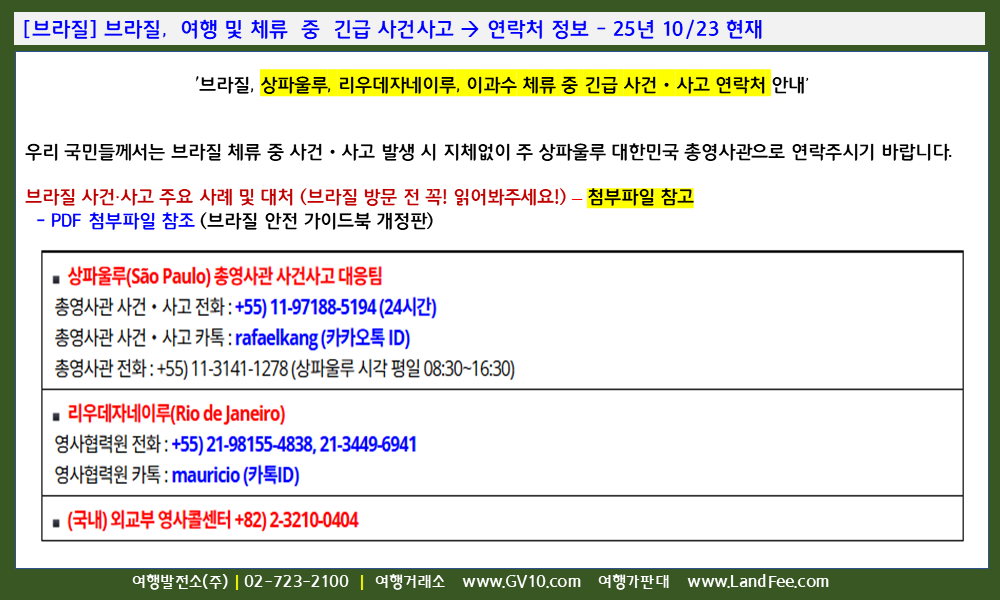 [브라질] 브라질, 여행 및 체류 중 긴급 사건사고 -> 연락처 정보 - 25년 10/23 현재